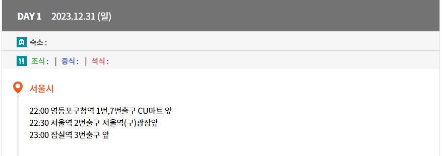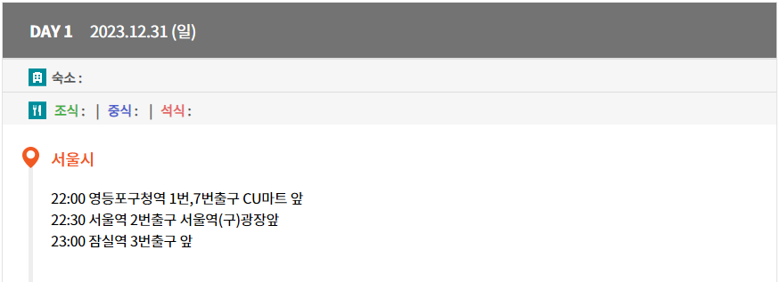 역시 해돋이 상품이라 22시에 영등포에서 출발하는 상품입니다. 서울역, 잠실역 시간 확인하세요.