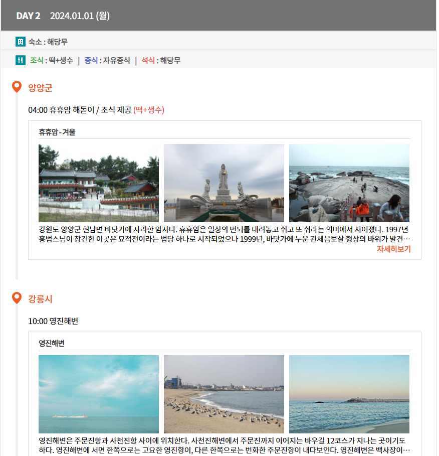 2일 차에는 양양 휴휴암에 도착해서 떡을 드시고 해돋이를 보시면 됩니다. 관세음보살과도 구경하시고 새해도 맞으시면 됩니다.